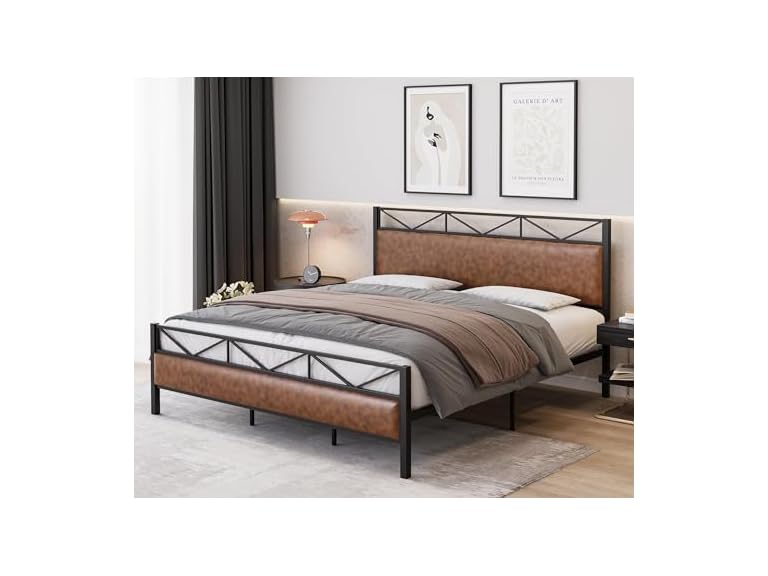 - (1) IDEALHOUSE Vintage King Bed Frame - Sturdy Metal Platform Bed Frame with PU Leather Headboard and Footboard, Upholstered Platform Bed with Ample Storage, No Box Spring Needed, Brown
