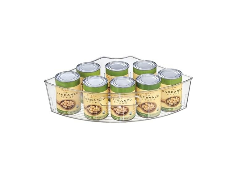 - CORNER CABINET STORAGE - Maximize your cabinet space with the iDesign Clear Wedge bins, perfectly sized for any corner cabinet lazy susan; Purchase four 1/4 bins form a complete circle, keeping spices, condiments, and more neat and organized
