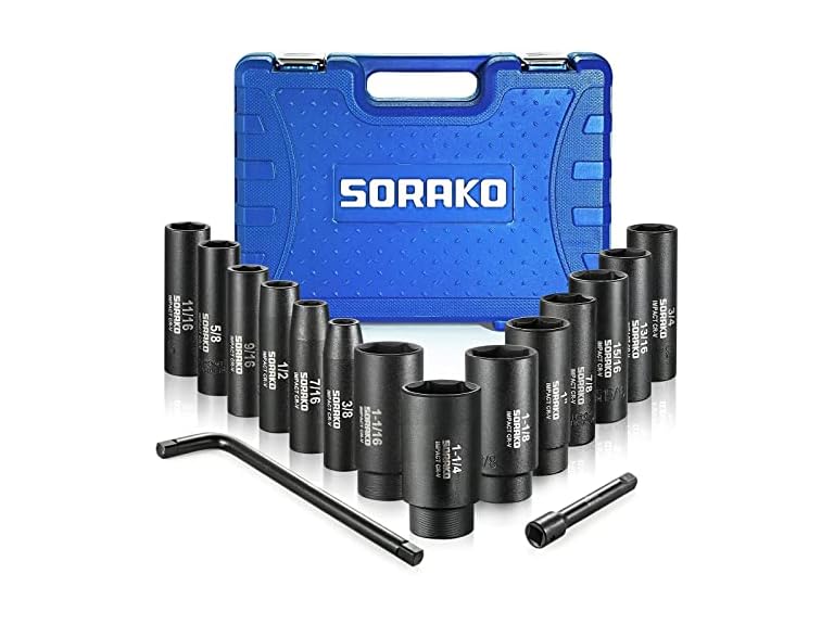- (1) Impact Socket Set 1/2” Drive, SORAKO16 PCS SAE Deep Socket Set (3/8-Inch to 1-1/14") Include 5” Extension Bar & 10” L Handle, Cr-V Steel 6 Point Standard Impact Socket with Portable Case