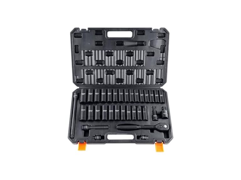 Impact Sockets Set 33pcs 6-Point 1/2in Drive Bit Ratchet Tool Kit Features : Cr-V Industrial-Grade Alloy Steel: Crafted from premium impact-grade alloy steel, our 1/2 impact socket set with Cr-V industrial-grade alloy steel offers exceptional enhancements in impact resistance and absorption. Through the utilization of vacuum heat treatment, the steel undergoes rapid heating and cooling processes, resulting in a polished and highly durable surface. This makes it well-suited for a wide range of operational environments. High Torque: Distinguished by its hexagonal drive design, which sets it apart from traditional designs lacking rounded corners, this socket tool set significantly reduces pressure exerted on fasteners during impact. As a result, it minimizes wear and effectively prevents bolt rounding and stripping. Easy-to-Read Size Markings: The size markings on these 33pcs impact driver socket set are meticulously laser-etched and rolled, ensuring effortless identification of socket sizes even in low light conditions. Convenient Storage & Transportation: The set is accompanied by a moderate-weight metal toolbox, providing convenient portability. The toolbox facilitates organized storage of the tools after use, eliminating the risk of unnecessary scattering or loss. Abundant Components: This comprehensive set includes an array of components, such as deep sockets 10mm, 11mm, 12mm, 13mm, 14mm, 15mm, 16mm, 17mm, 18mm, 19mm, 20mm, 21mm, 22mm, 23mm, 24mm, 3/8", 7/16", 1/2", 9/16", 5/8", 11/16", 3/4", 13/16", 7/8", 15/16", 1". Other components include extension bars in lengths of 3",5",10", 1/2" 72 teeth ratchet wrench, 1/2" impact universal adapter, 1/2" to 3/8" adapter, and 3/8"to1/2".