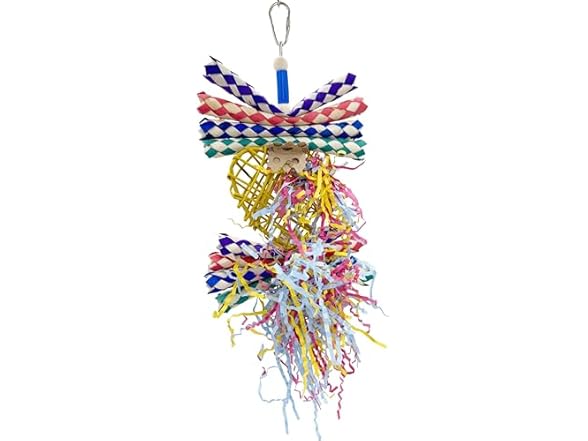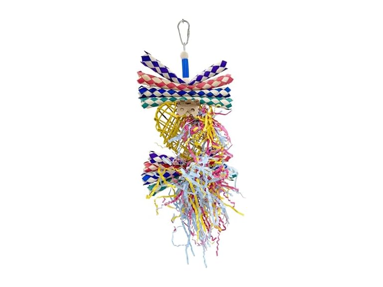 The toy’s lightweight design is perfect for small to medium-sized birds, encouraging them to peck, pull, and forage. The combination of textures, from the sturdy willow to the soft crinkle paper, keeps birds mentally and physically active while promoting natural chewing and foraging behaviors. A sturdy quick-link connector at the top makes installation in any cage effortless, and the toy’s bright, cheerful colors add a decorative touch to your bird’s environment.