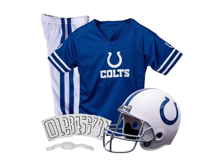 - (1) Franklin Sports Indianapolis Colts Kids Football Uniform Set - NFL Youth Football Costume for Boys & Girls - Set Includes Helmet, Jersey & Pants - Small
