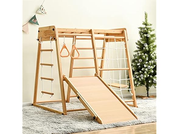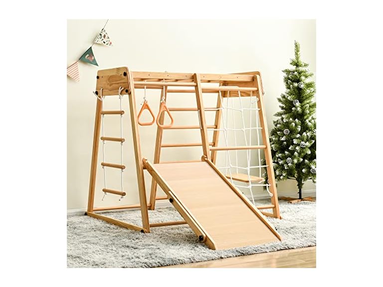 - Indoor Playground 8-in-1 Jungle Gym Toddler Climbing Toys with Slides and Play Table Wooden Rock Climbing Ladder with Rope Wall Swing Rings Kids Slides Playset Natural Wood As Shown One Size