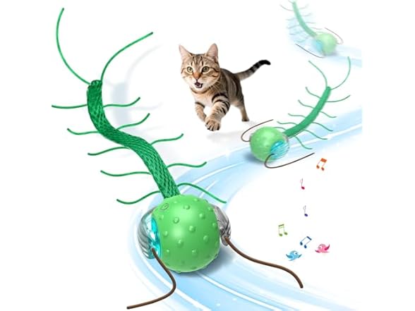 - ✔Smart Motion-Activated Play – Long press 3s to power on, electric cat ball runs 5mins and get standby. Starts rolling again when your cat touched, triggering unpredictable sprints and spins!