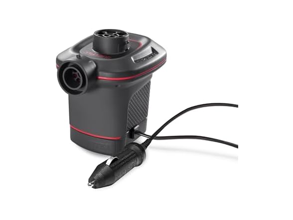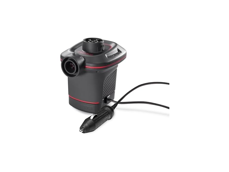 - (1) INTEX 66656WA QuickFill 12 Volt DC Electric Pump Inflates and Deflates Air Mattresses, Kayaks, Boats – Includes 3 Interrconnecting Nozzles – Sleek and Compact Design – 650 L/Min Air Flow – Outdoor Use