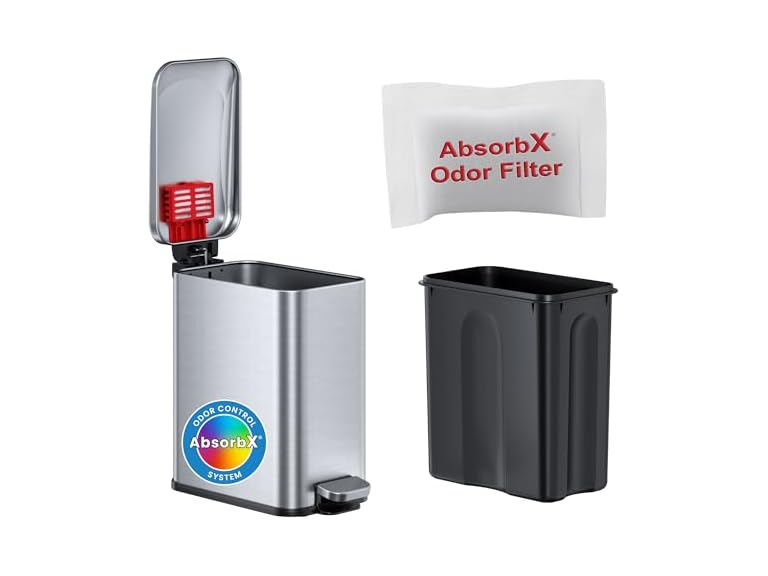 - (1) iTouchless 1.32 Gallon SoftStep 2.0 Bathroom Trash Can with Odor Absorber, Small Stainless Steel Step Pedal Garbage Bin with Removable Inner Bucket, Next Gen Quiet Close Lid Technology