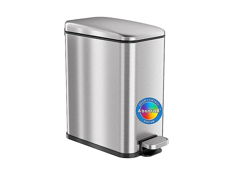 - (1) iTouchless 5 Liter / 1.32 Gallon SoftStep Bathroom Trash Can with Lid & AbsorbX Odor Filter – Slim Stainless Steel Wastebasket with Inner Bucket for Small Spaces