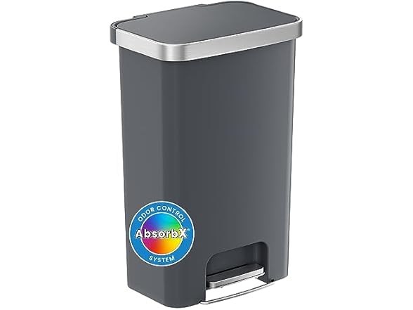 - PREMIUM FEATURES – Trash Bag Retainer Rim, Relaceable Air Damper, AbsorbX Odor Filter, Lid Stay-Open Mode, Rubber Pads on Non-Skid base.