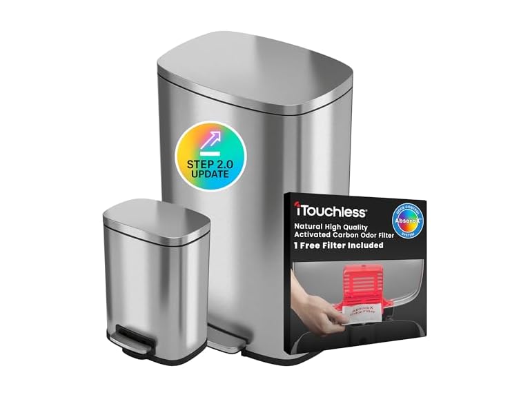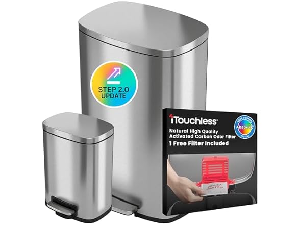 - iTouchless Step 2.0 Technology SoftStep Combo Trash Can Set, 13.2 & 1.32 Gallon Stainless Steel Bins with AbsorbX Odor Filters and Inner Buckets for Kitchen Bathroom Home Office Store Garage School