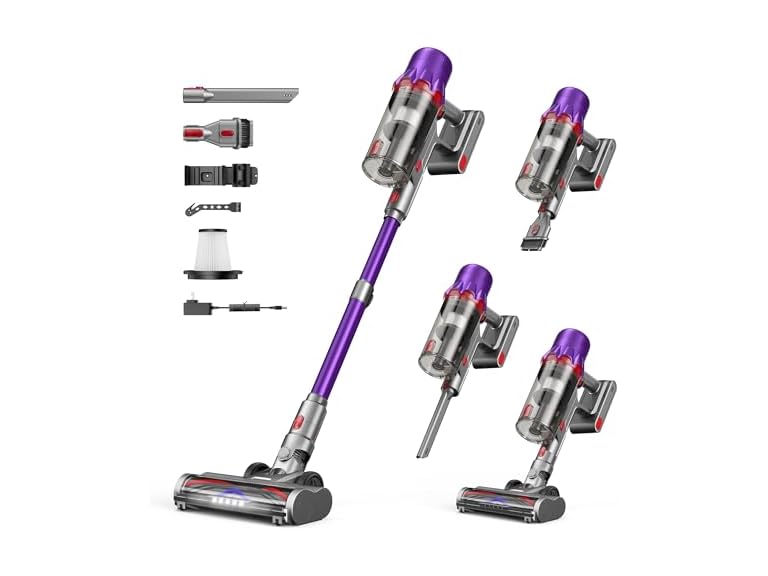 - 【All-in-One Stick Vacuum with Multi Attachments】Includes a crevice nozzle, brush head, and LED roller for flexible cleaning. This lightweight stick vacuum handles sofas, stairs, and cars with ease—ideal for homes with kids, pets, or small living spaces.