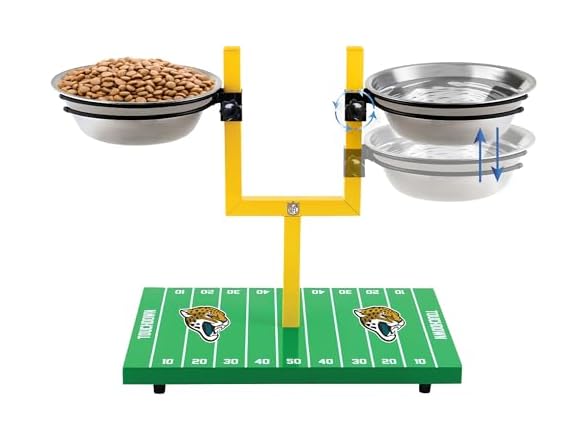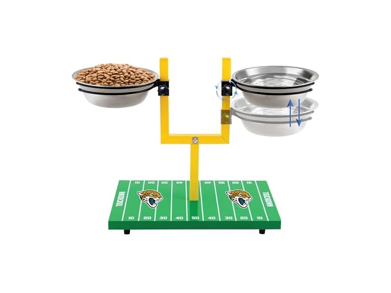 - (1) NFL Jacksonville Jaguars Goalpost Football Field Dog Feeder – Adjustable Elevated Dog Bowls with Stand, 2 Stainless Steel Bowls, Non-Slip Rubber Feet, Raised Pet Feeder for Large & Small Dogs, Cats.