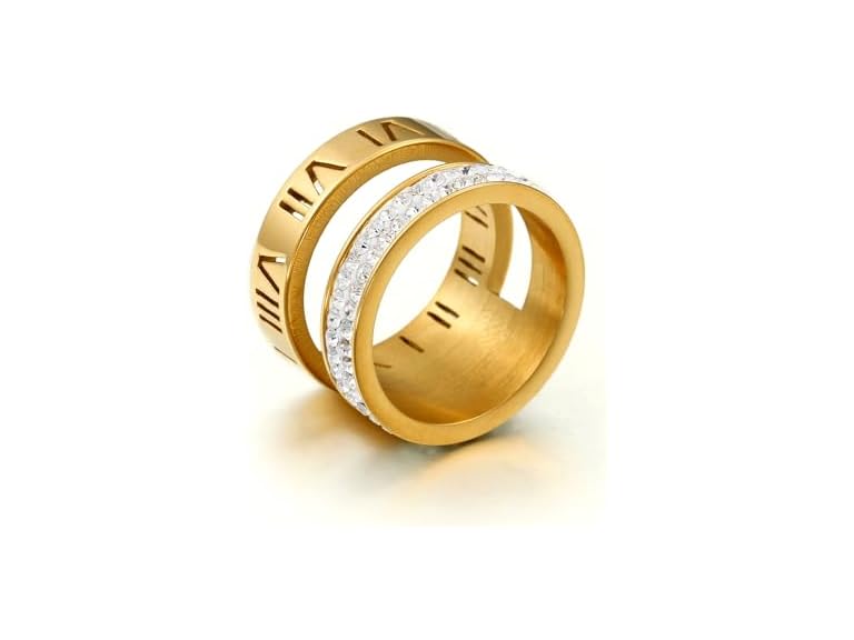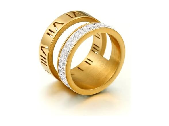 - (1) Jarlinwel Love Friendship Ring Cubic Zirconia 14K Gold Plated Roman Numeral Ring for Women Stainless Steel Wedding Statement Thumb Ring Bands (8, Gold)