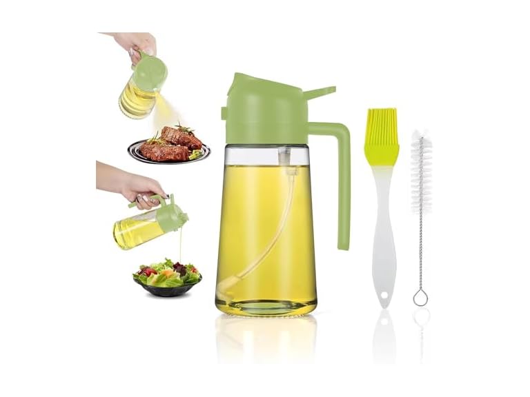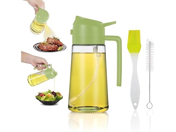 - (1) JAZZER Oil Dispenser Bottle for Kitchen - 2 in 1 Olive Oil Dispenser and Oil Sprayer - 16oz/470ml Olive Oil Bottle - Oil Sprayer for Cooking, Kitchen, Air Fryer, Salad, BBQ (with 2 Brushes) (Green)