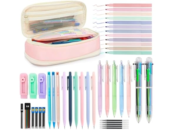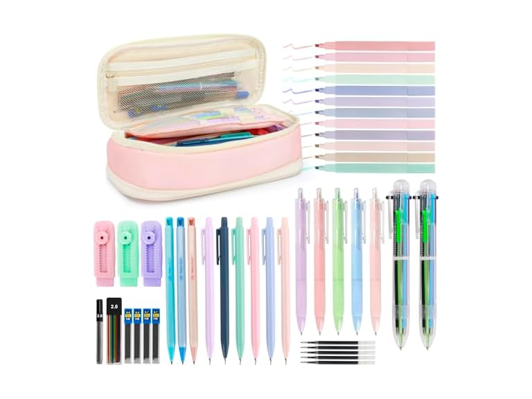 - Complete 43-Piece Study & Art Arsenal- Perfect for Dorm Rooms to Lecture Halls- This all-in-one kit crams every essential: 12 soft highlighter shades, 3 lead sizes (0.5mm equations/0.7mm essays/2.0mm sketches), 6-color instant-switch pens, and smudge-proof gel pens. All housed in our pink organizer case