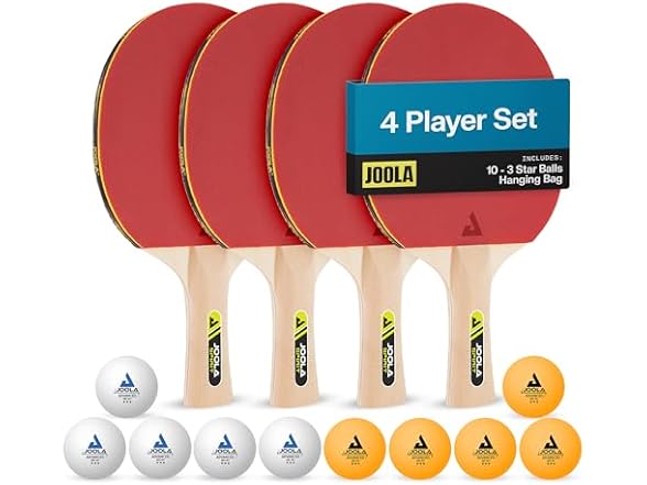 - (1) JOOLA Family Premium Ping Pong Paddles Set of 4 - Advanced Table Tennis Rackets, 10 Training 3 Star Ping Pong Balls, and Storage Case - Competitive or Recreational Play - Indoor and Outdoor Compatible