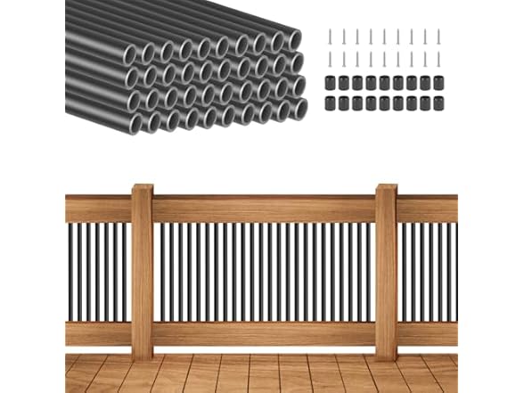 - (1) Jorviz 50 Pack 36" Aluminum Deck Balusters, 3/4" Diameter Black Metal Spindles for Staircase, Round Hollow Stair Balusters with Connectors and Screws for Deck Railing Porch Outdoor