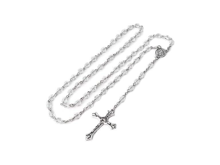 - These Rosary beads Catholic are made of 6mm crystal rhinestones & the link chain is silver plated zinc alloy. First Communion Rosary for girls , rosary for boys & can be use as womans rosary necklace