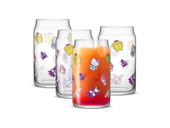 - JoyJolt Sanrio Hello Kitty and Friends Daydream Tumbler Glasses, Kitchen Drinking Glasses Set of 4, 16oz Soda Can Shaped Glass Tumblers, Clear Glass Cups, Kawaii Cute Hello Kitty Stuff
