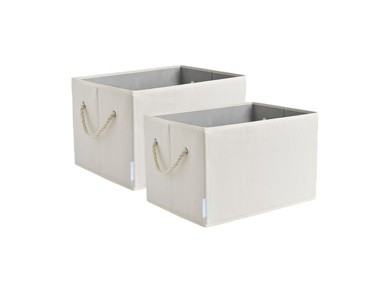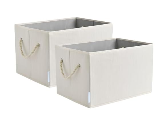 - (1) JS HOME Pack of 2 Storage Bins Closet Organizer System, Sturdy Foldable Storage Boxes for Organizing Clothing, Books - Shelf Organizer Shelves Basket Storage Bin with Handles Ivory White
