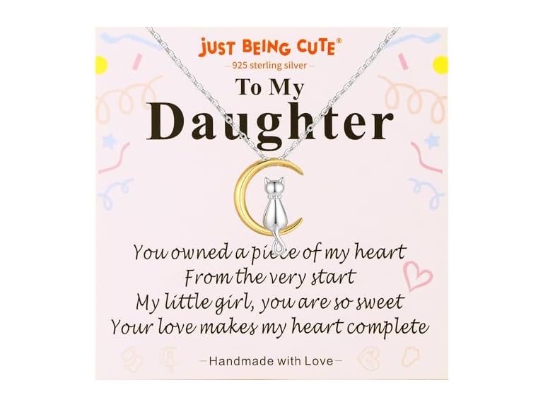 - (1) Just Being Cute Cat On Moon Necklace, Cute Gifts for Daughter Girls Cat Necklace 18K Gold Plated 925 Sterling Silver with Lovely Card for Daughter