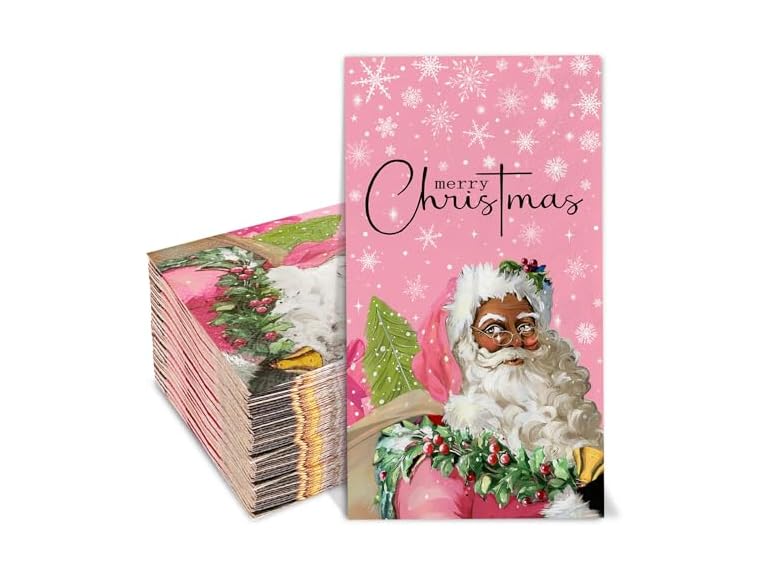 - (1) Kamiilah 60 Pink Santa Claus themed Guest Napkins 4.3 -7.8Inch Santa Claus Snowflakes Disposable Lunch and Dinner Napkins Christmas Day Party Family Gathering Table Decoration