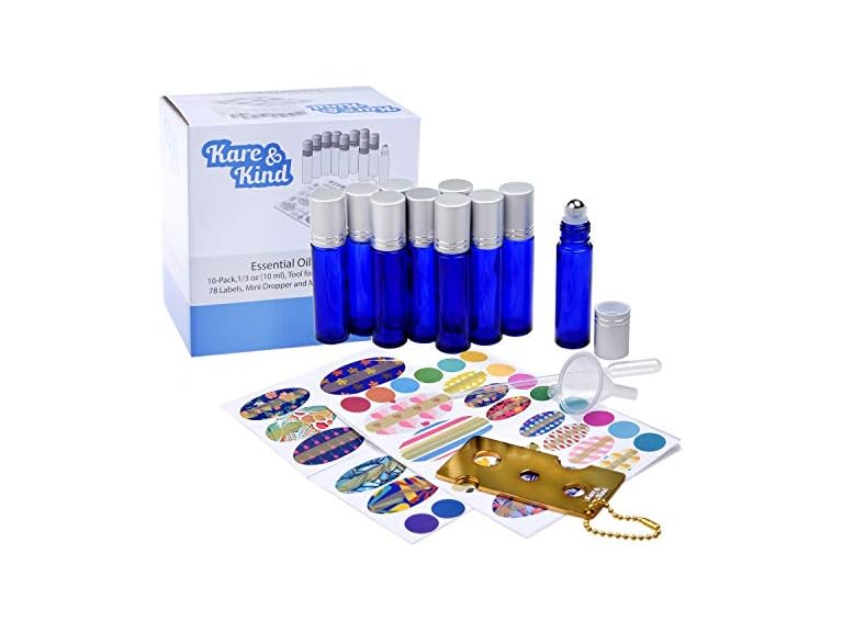 - The Kare & Kind essential oil bottle kit includes 10 bottles, a tool to open/seal the bottles, stickers for labelling and a mini dropper + mini funnel for easy filling.