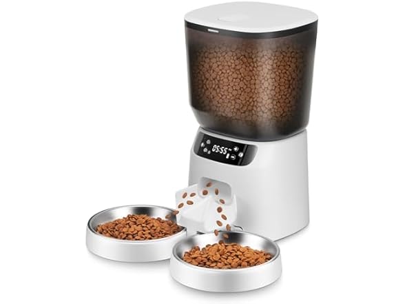 - Feed Two Cats: The automatic cat feeder is perfect for two pets. It features a unique meal divider that ensures an even distribution of food, preventing any potential conflicts between the two cats during mealtime, perfect for long weekends and short business trips, providing you with peace of mind for 2 happy and well-fed pets.