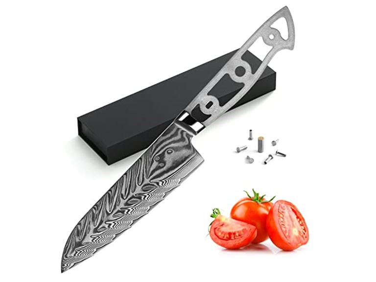 - KITCHEN KNIFE MAKING BLANK – This woodworking project kit includes a full tang knife blank ONLY. Customize your very own knife handle by using wood, metal, Micarta, or even leather to create a cool accent. Give your Santoku chef knife a unique personality by hand finishing all the parts. BONUS: Includes 3 sets of metal pins and a Mosaic center pin.