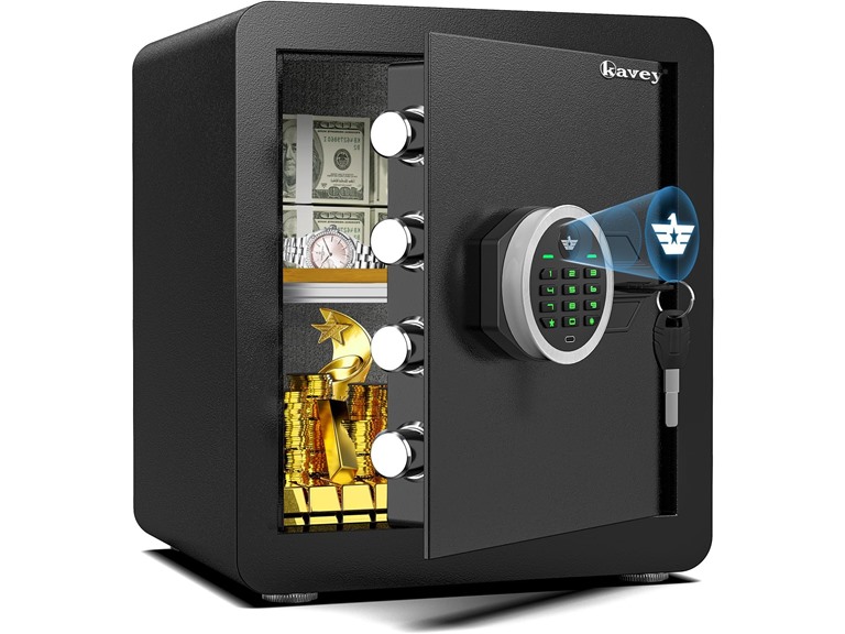 - 【About Kavey Safe】 Developed and designed in the US, our safes feature 3D glowing digital buttons for faster unlocking and zero errors. The unique embedded 'Eagle Star' design is more stereoscopic and holds a US appearance patent. With universal emergency power jack, you don't have to worry about running out of power.