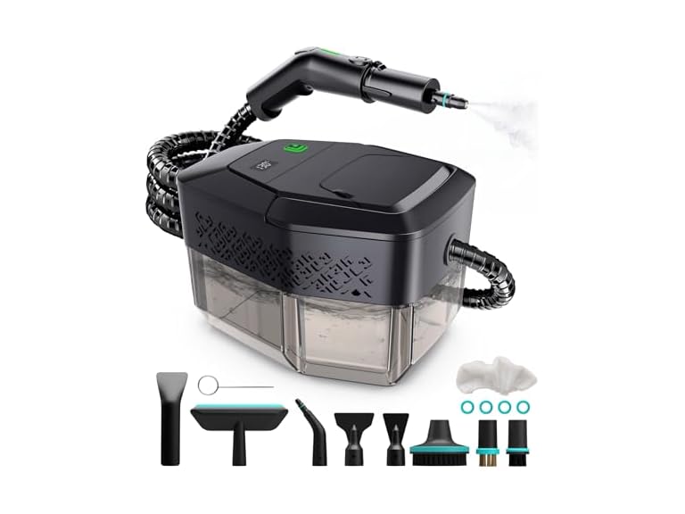 - [Fully Upgraded Heating Element] The portable steam cleaner features the latest upgraded heating element with 1500W power, and heats up in just 15 seconds, 30% faster than traditional steam cleaners. It generates 4-bar high pressure and 293°F steam, penetrating deeply to deliver powerful, chemical-free cleaning that removes tough grease and crevice grime. Ideal for steam cleaning home, sofa, kitchens, pet areas and more.