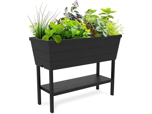 Take your gardening efforts to the next level with the Urban Bloomer elevated garden bed from Keter. You don't need a house in the country to enjoy farm-fresh produce and herbs. Whether you want to become more self-sufficient, reduce grocery costs or just savor the flavor of freshly picked fruits and veggies, our planter offers easy access to nature's bounty in suburban or urban settings. The planter is designed to be an attractive addition to your outdoor decor. Large enough to accommodate 12. 7 gallons of soil for growing your favorite juice or smoothie ingredients, it's also compact enough to fit comfortably with your patio furniture and grill. Its smooth lines add a modern touch to your outdoor living space, and its wood-look exterior blends beautifully with most patio furniture. Heavy-duty resin construction means no rusting or rotting, and the UV protected material prevents fading, even after years of sun exposure. The container also works well as an elevated flower box planter. Enjoy these additional benefits from our raised bed: Dimensions: 32. 3 in. L x 14. 7 in. W x 30. 7 in. H 12. 7 gallon soil capacity Simple garden maintenance Attractive design Encourages healthful eating Perfect for apartment and condo living Included seed starting tray Great for gardeners of all ages Teaches kids how their food is grown Self-watering system and drainage tap for hassle-free hydration