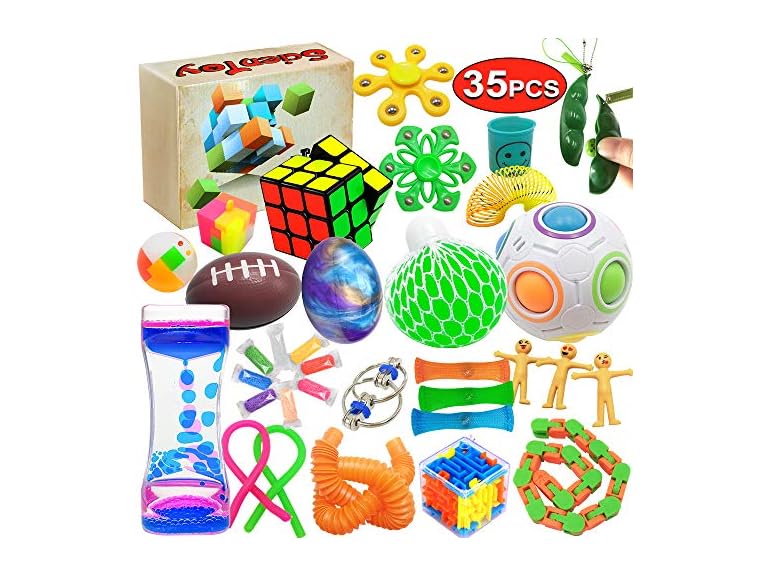 - (1) Scientoy Fidget Toy Set, 35 Pcs Sensory Toy for ADD, OCD, Autistic Children, Adults, Anxiety Autism to Stress Relief and Anti Anxiety with Motion Timer, Perfect for Classroom Reward with Gift Box