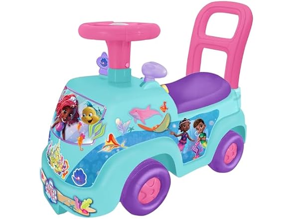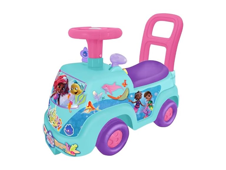 MY FIRST ADVENTURE RIDE-ON: ARIEL SEA - Embark on a magical journey with Ariel and experience the ultimate adventure on this exciting ride-on! Designed in a delightful combination of blue, purple, and pink, this ride-on is adorned with vibrant sea-themed graphics that capture the enchanting world under the sea. Your little adventurer will be thrilled to join Ariel on a ride filled with wonder and fun. This adorable ride-on toy brings Ariel’s world to life with enchanting sounds and flashing lights that add a touch of excitement to every ride. The interactive dashboard features fun activities, including a turning seashell key and sliding gears, offering an engaging and realistic driving experience. Beneath the seat, children will find a hidden bonus storage compartment—perfect for stashing small treasures, toys, or other keepsakes they collect during their adventures. Constructed with safety and durability in mind, this ride-on is designed for hours of stable, secure play, whether indoors or outdoors. It’s a wonderful way to develop essential skills like gross motor abilities, balance, and coordination while encouraging independent play and exploration. With its sturdy seat-back handle, younger children can also use it for push-along fun as they build confidence in their movements. The ride-on is powered by 2 AA batteries (included), so it’s ready to light up your child’s playtime right out of the box. Perfect for toddlers and young children ages 12 months and up, this ride-on offers a magical and safe way for kids to grow, learn, and play. Whether cruising through their imaginary underwater kingdom or exploring at home, your little one will love this beautifully designed ride with Ariel!