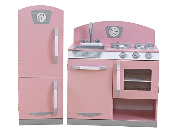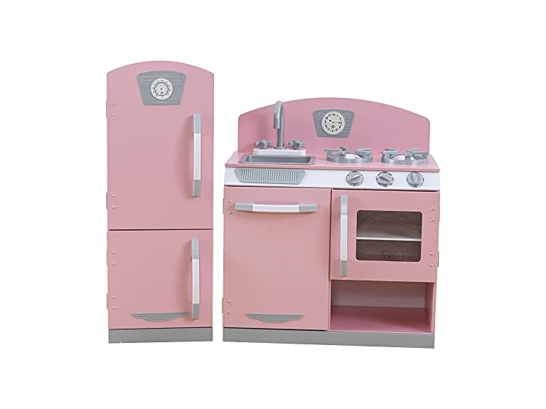 - KidKraft Retro Wooden Play Kitchen and Refrigerator 2-Piece Set with Faucet, Sink, Burners and Working Knobs, Pink, Gift for Ages 3+
