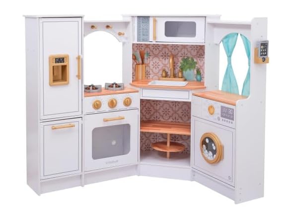 - KidKraft Ultimate Corner Wooden Play Kitchen with Lights & Sounds, Play Phone and Curtains, White