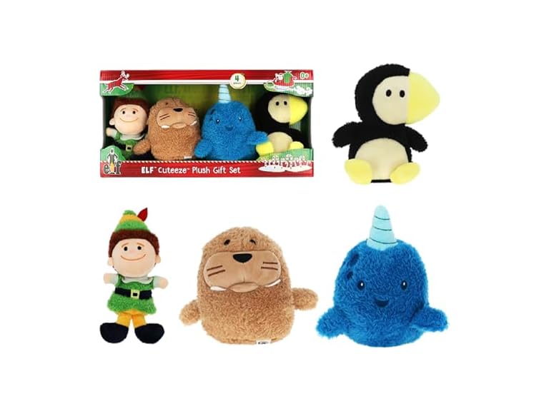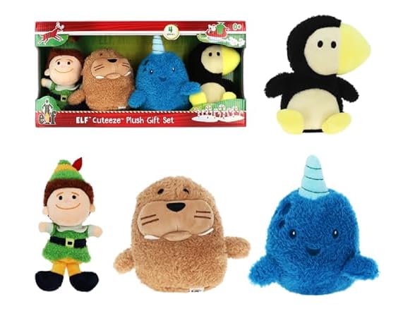 - Elf 4-Piece Set: Celebrate the holiday season with the Elf and Friends Cuteeze Collectible Plush set, featuring Buddy the Elf, Arctic Puffin, Mr. Narwhal, and Baby Walrus in a festive keepsake box for fans of all ages.