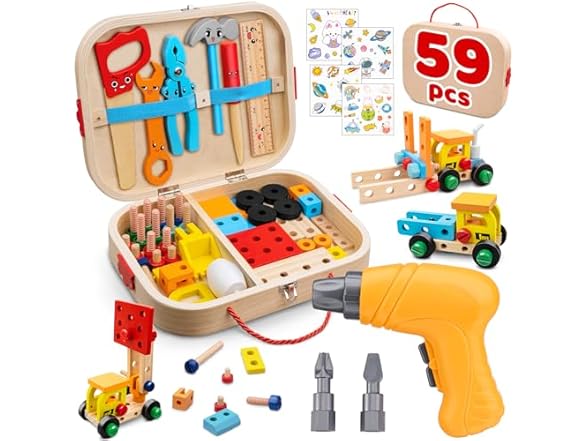 - 【Multi-functional Montessori Toolbox】This wooden tool set gives kids a fun pretend play time. It comes in a wooden box with a safe electric drill, two bits, hammer, screwdriver, saw, rulers, screws, and building parts. Children can play, build, and create anywhere at home or in a small workshop. It is a nice present for boys and girls age 3 4 5 6.