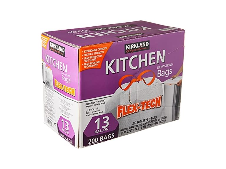 - (1) Kirkland Signature Drawstring Kitchen Trash Bags - 13 Gallon - 200 Count