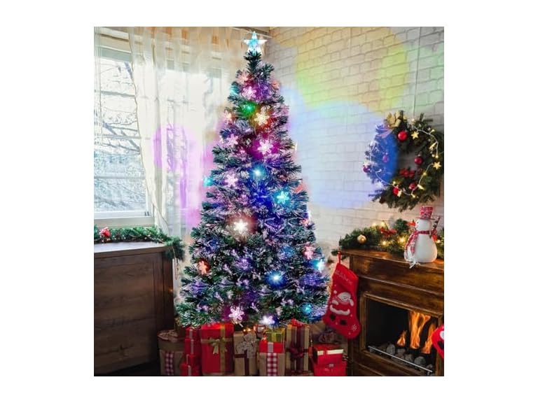 - 6ft tall with 31×31×71-inch size, equipped with 230 branch tips, 36 snowflakes and a top star. Pre-installed RGB color-changing LED and fiber optic lights emit full, charming glow at night, easily creating eye-catching Christmas atmosphere.