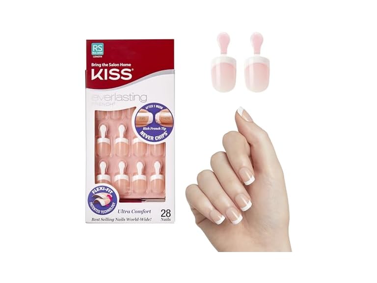(1) Kiss Everlasting French Nail Manicure, Chip-Free with Flexi-Fit Technology, Real Short, "Endless", Nail Kit with Pink Nail Glue (Net Wt. 2 g / 0.07oz.), Mini File, Manicure Stick, and 28 Fake Nails