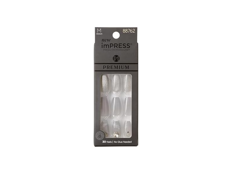 - KISS imPRESS Press-On Manicure Premium Collection Fake Nails - Legacy, Gray, V-Cut Stone, Medium & Ballerina/Coffin Shape, Easy To Apply, Super Hold, Chip Proof, Smudge Proof, No Dry Time | 30 Count