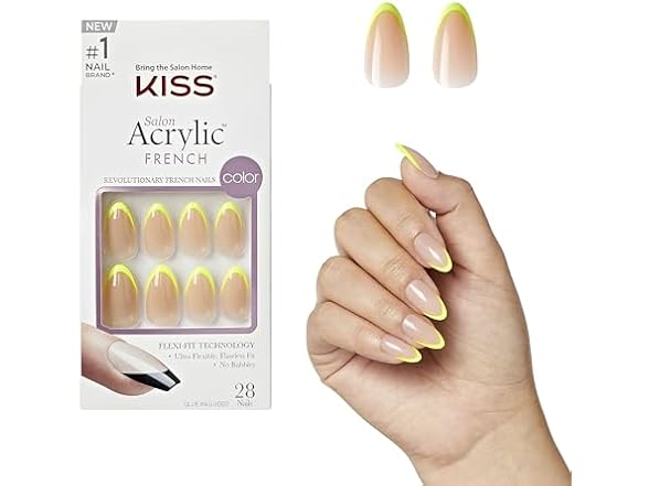 - KISS Salon Acrylic, Press On Nails, Nail glue included, 'Hype', Light Neon Yellow, Medium Size, Almond Shape, Includes 28 Nails, 2G Glue, 1 Manicure Stick, 1 Mini File