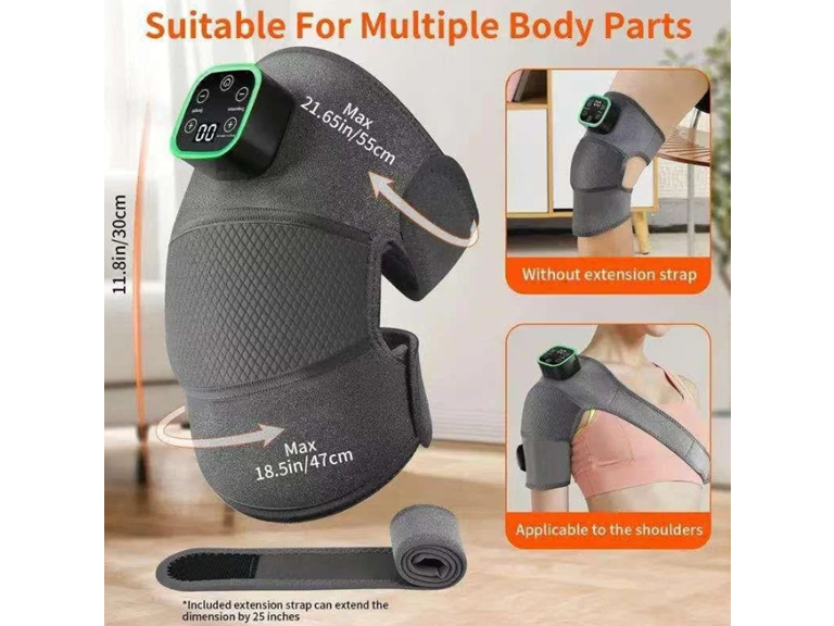 - 3 in 1 Shoulder Elbow Knee MassageThe vibration knee massager can massage your whole knee and the shoudler and elbows areas, ergonomic designed for different sizes. Massaging knee pad includes two extension straps, so that the massager can be used on legs, knees, elbows, arms, shoulders, etc, it can as a shoulder wrap or knee heating pads, fully adjustable to fit your body size and shape ensures comfort for all men and women.