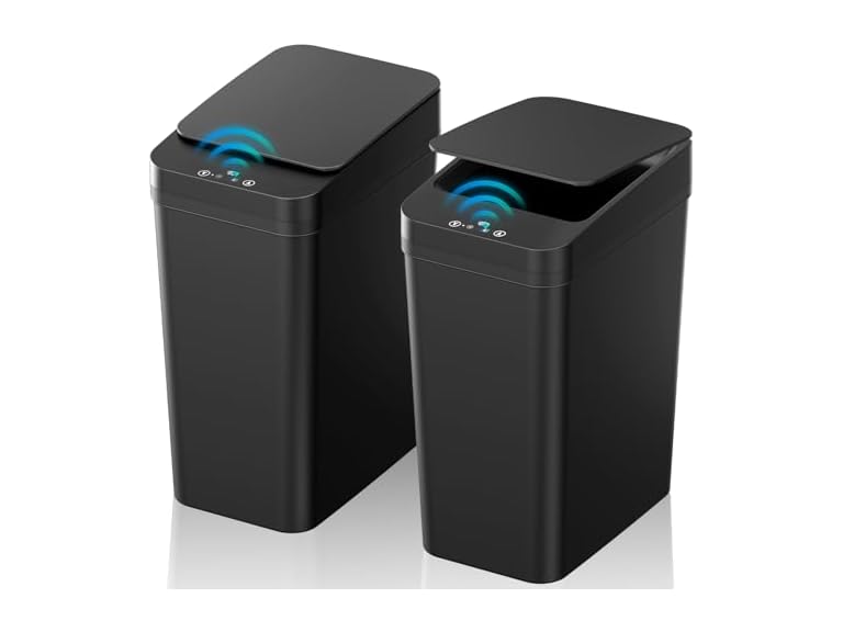 - (1) KOEYLE Bathroom Trash Can with Lid, KOEYLE 2 Pack 2.2 Gallon Automatic Touchless Garbage Can, Small Motion Sensor Smart Trash Can, Slim Waterproof Trash Bin for Bedroom, Bathroom, Office, Living Room (Black)