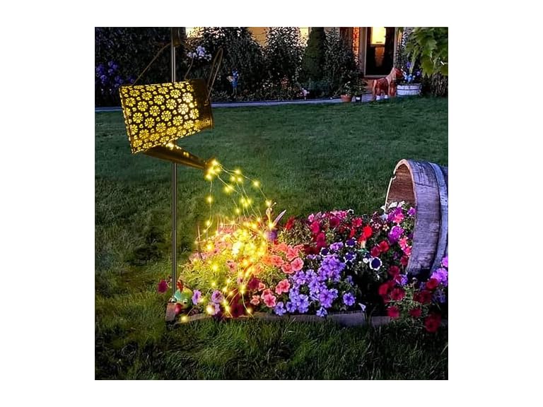 - Illuminate your outdoor space with our captivating solar watering can lights. Crafted for creativity, durability, and efficiency, these lights offer a charming ambiance with their retro patterns. Powered by solar energy, they effortlessly brighten up gardens, patios, flowerbed, walkway, yard, lawn, courtyard and pathways.
