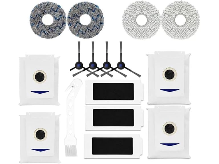 - Includes 4 replacement side brushes, 3 replacement filters, 4 Soft Mop Pads(2 white+2 dark), 4 dust bags,1 Cleaning brush