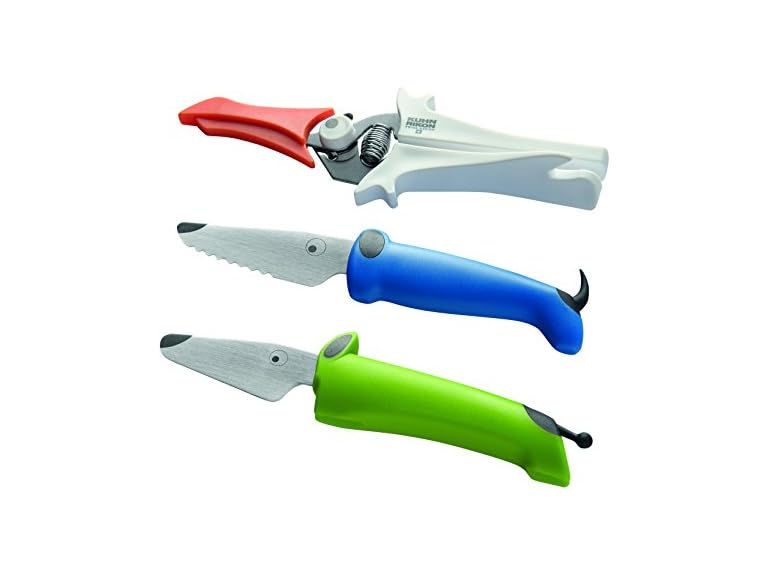 - Kuhn Rikon Kinderkitchen® Kids Chef Knife Set With Scissors, 3 Pieces, Green/Blue/White| Cutting Tools Made for Real Cooking | Child Friendly Animal Designs With Hand Guard & Snipper Cover For Safety