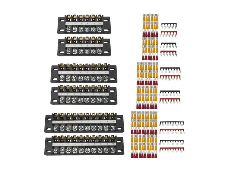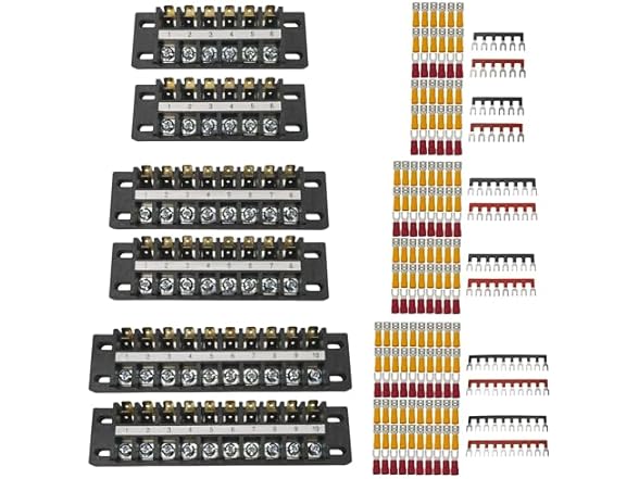 - ALL-IN-ONE BUNDLE: Includes 2 x 6-position terminal blocks with jumpers, 2 x 8-position terminal blocks with jumpers, 2 x 10-position terminal blocks with jumpers, 48 red fork connectors, and 96 yellow quick connectors