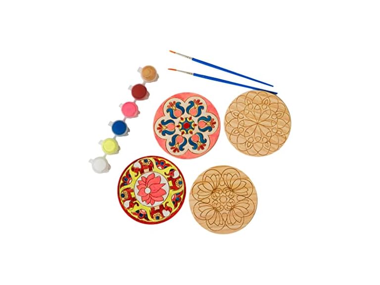 - INCLUDES EVERYTHING YOU NEED: The DIY kit includes 4 Rangoli design engraved coasters, 6 colored paints, and 2 paint brushes.