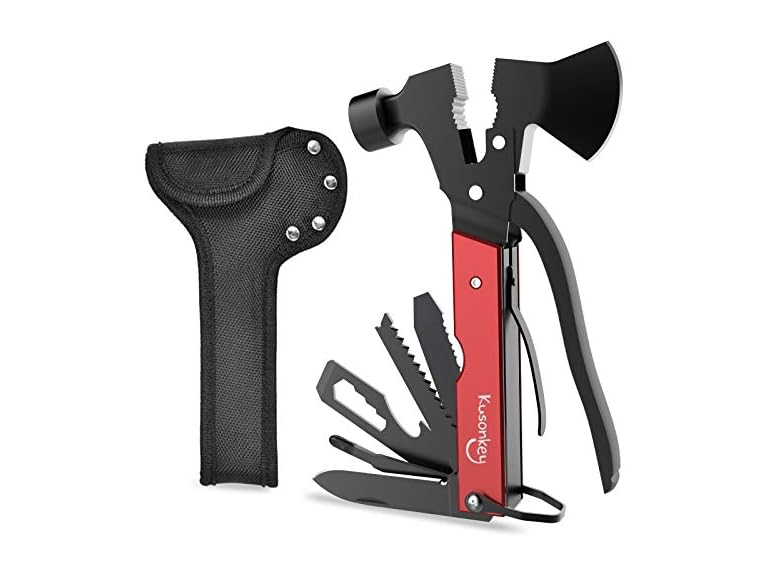 - (1) Multitool Camping Accessories Gear Tools Gifts for Men, Kusonkey Survival Gear 16 in 1 Hatchet with Knife Axe Hammer Saw Screwdrivers Pliers Bottle Opener Durable Sheath, Multitools